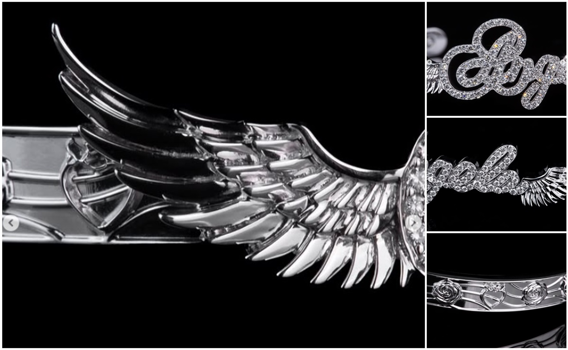 El accesorio, valuado en aproximadamente 7 mil dólares, fue elaborado en oro blanco y diamantes por la firma joyera Braggao. Su diseño incluye: