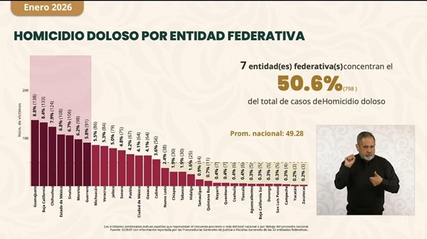 A nivel nacional, el informe también advierte que siete entidades concentran poco más de la mitad de los homicidios dolosos: Guanajuato, Baja California, Chihuahua, Estado de México, Sinaloa, Morelos y Guerrero. El promedio diario nacional en enero fue de 49.28 casos.